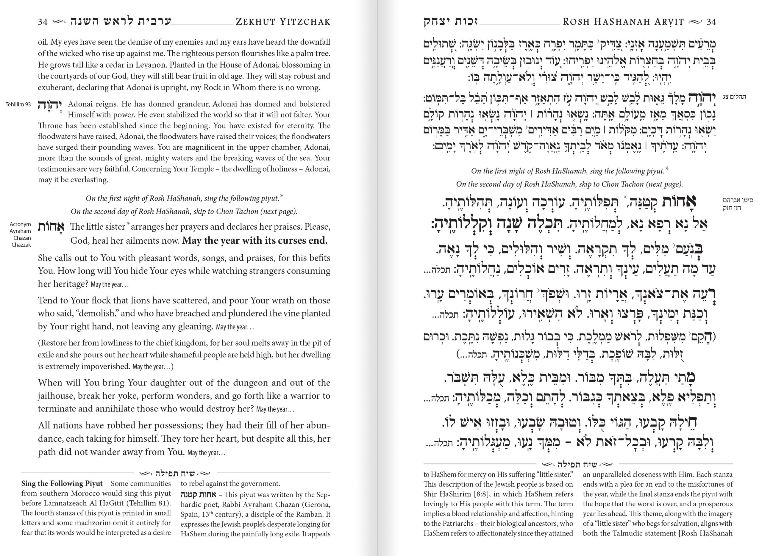 This is the world’s first bilingual Hebrew/English Moroccan Sephardic Yamim Noraim machzorim. Two prayer books – Rosh HaShanah (Zekhut Yitzchak) and Yom Kippur (Emet LeYa’akov) – according to the traditions of the Spanish Moroccan communities.